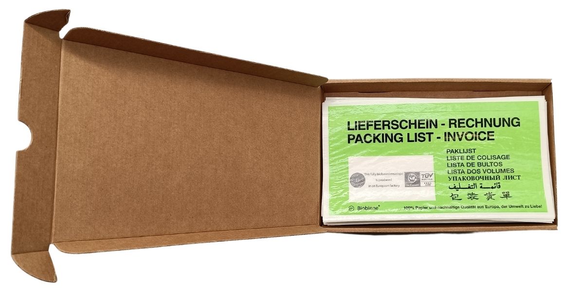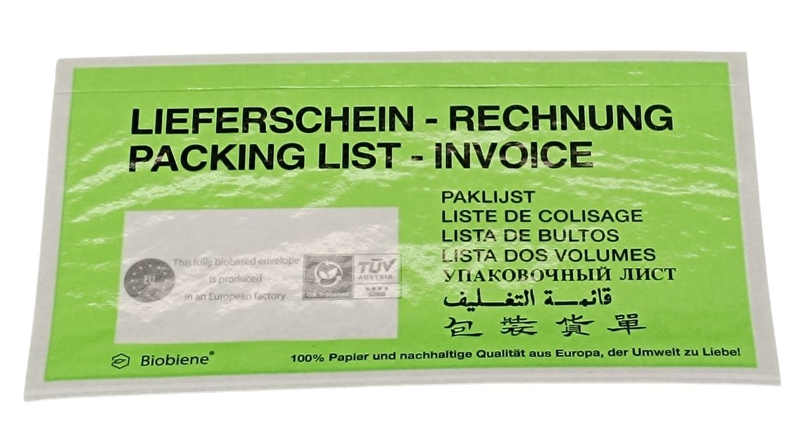 Unsere grünen, umweltfreundlichen, aus Papier bestehenden Dokumententaschen DIN Lang bieten durch Lieferschein- und Rechnungsnachweis mehr Versandsicherheit. Sie ermöglichen bei einer eventuellen Beschädigung der Adressaufkleber/Label eine zusätzliche Adressidentifikation und schließen ggf. einen kompletten Paketverlust aus.